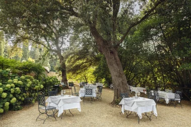 Nella limonaia della tenuta, e nello splendido giardino che affaccia sul bosco del parco monumentale, tra glicini e alberi secolari, trova posto l’Osteria di Torre a Cona.